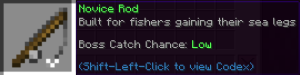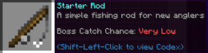 | Starter Rod | Crafted using the vanilla fishing rod recipe. | 0.50% | |